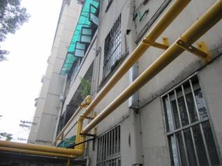 在管道搭建過程中,樓房外墻上各家各戶安裝著的雨棚和空調(diào)室外機成了施工中的一大阻礙。為了盡快解決這根燃氣主管線的鋪設(shè)問題,施工員多次上門溝通及勸導(dǎo)無效,最后提出獨立支墩的設(shè)計方案,與住戶達成一致意見,即滿足了住戶的要求,又能使施工得以繼續(xù)開展。