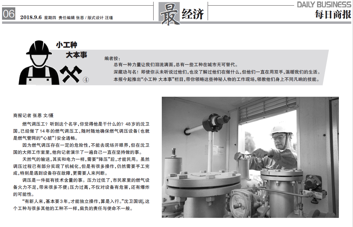調(diào)壓是一件挺有技術(shù)含量的事!“有新人來,基本要3年,才能獨(dú)立操作,才算入行!闭{(diào)壓工種與其他工種都不一樣,肩負(fù)千家萬戶的用氣穩(wěn)定與安全,身上的使命和責(zé)任不一般。核對(duì)壓力數(shù)據(jù)、檢漏修補(bǔ)、故障檢查維修,每一項(xiàng)工作都需要常年的經(jīng)驗(yàn)積累。對(duì)14年工齡的沈大師來說,調(diào)壓設(shè)備已經(jīng)非常熟悉,常;ㄉ蠋追昼娋湍苷业饺?xì)庑孤c(diǎn)。