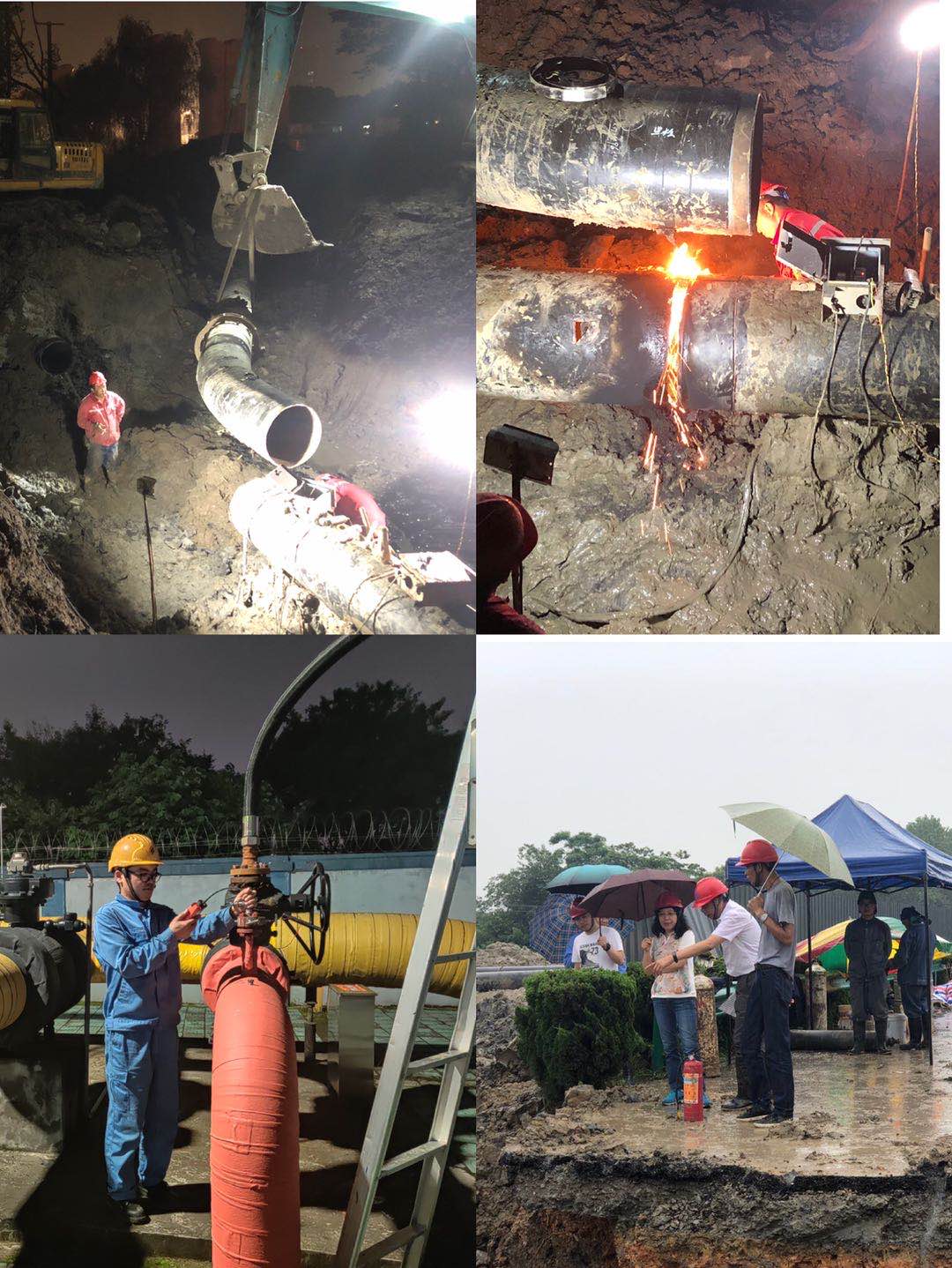 連續(xù)作業(yè),協(xié)同作戰(zhàn)民生供氣不影響。S2(良渚站-蘇嘉路閥室)、S13(蘇嘉路閥室-余杭站)共有8個(gè)割接點(diǎn),割接作業(yè)將影響臨安區(qū)供氣、中石化杭燃暫停加氣。在集團(tuán)公司統(tǒng)一部署下,杭天公司精心準(zhǔn)備,周密策劃。一是提前統(tǒng)籌好施工進(jìn)度,確保三家施工單位進(jìn)度保持同步。二是成立割接作業(yè)組織指揮體系,編制投運(yùn)、割接置換方案,多次召開專題會(huì)論證方案安全性、可操作性。三是編制運(yùn)行調(diào)度保障方案,綜合考慮接氣門站、氣量需求預(yù)測(cè)、高壓管容、LNG應(yīng)急供應(yīng),細(xì)化保供原則、作業(yè)流程。戰(zhàn)風(fēng)雨,連續(xù)作業(yè)顯鐵軍精神。6月30日下午15點(diǎn)10分,S2割接置換開始,現(xiàn)場(chǎng)有序執(zhí)行降壓、放散、氮?dú)庵脫Q,切割、打磨、對(duì)口、焊接、拍片、防腐,天然氣置換和升壓、運(yùn)營(yíng)調(diào)度調(diào)整等各項(xiàng)作業(yè)流程。連綿的梅雨,工作人員一身泥濘,7月1日22點(diǎn)17分,歷時(shí)32小時(shí),圓滿完成。7月5日下午15點(diǎn),S13三家施工單位同步作業(yè)開始,歷時(shí)40小時(shí),期間還經(jīng)歷了防汛三級(jí)響應(yīng)的考驗(yàn)。
