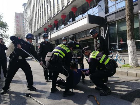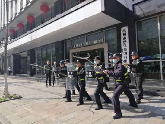 3月2日14:40分,燃?xì)獯髲B一樓大廳門前,1名手持長(zhǎng)棍的可疑男子企圖進(jìn)入大廳,執(zhí)勤保安上前詢問、并要求測(cè)體溫和身份登記。該男子突然拔出“兇器”企圖強(qiáng)闖。值勤保安立即利用身邊的盾牌、鋼叉與“不法分子”周旋對(duì)峙,分公司應(yīng)急預(yù)案隨即啟動(dòng),物管部主任沈梁華、安全管理員王亮等聞?dòng)嵙⒓蹿s到大廳……在大廈增援保安、西溪派出所110巡邏民警共同努力下,最終成功將“暴徒”制服。