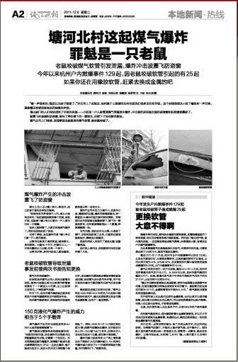 截至2011年11月底,杭州市區(qū)戶內(nèi)燃爆事件已發(fā)生129起。從發(fā)生的原因分析,主要是皮管使用、灶具質(zhì)量和使用不當(dāng)造成,占的比例分別為42%、32%和8.5%,在皮管使用問題中被老鼠咬破造成燃爆的為25起,占戶內(nèi)燃爆事件的19.4%。