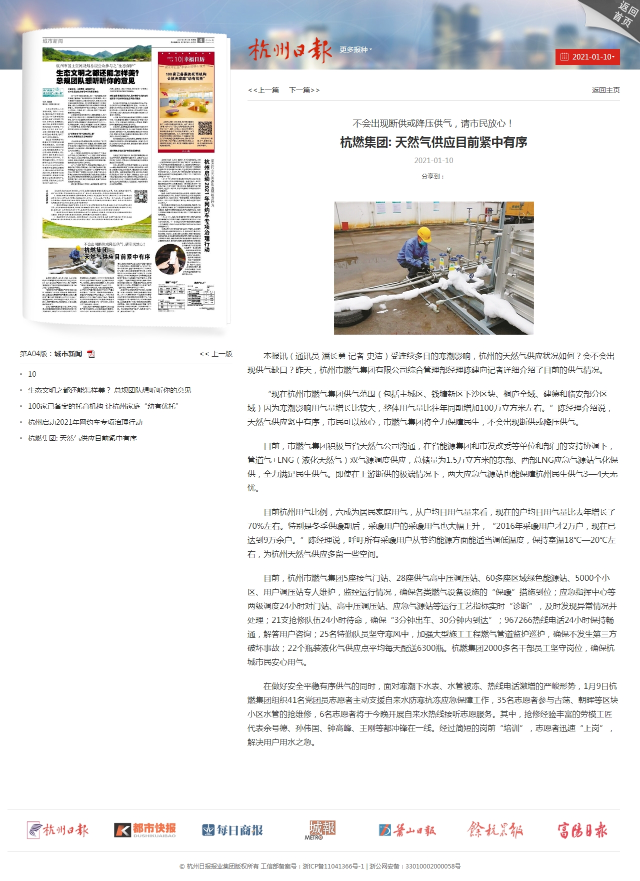 目前,市燃?xì)饧瘓F(tuán)積極與省天然氣公司溝通,在省能源集團(tuán)和市發(fā)改委等單位和部門的支持協(xié)調(diào)下,管道氣+LNG(液化天然氣)雙氣源調(diào)度供應(yīng),總儲量為1.5萬立方米的東部、西部LNG應(yīng)急氣源站氣化保供,全力滿足民生供氣。即使在上游斷供的極端情況下,兩大應(yīng)急氣源站也能保障杭州民生供氣3—4天無憂。