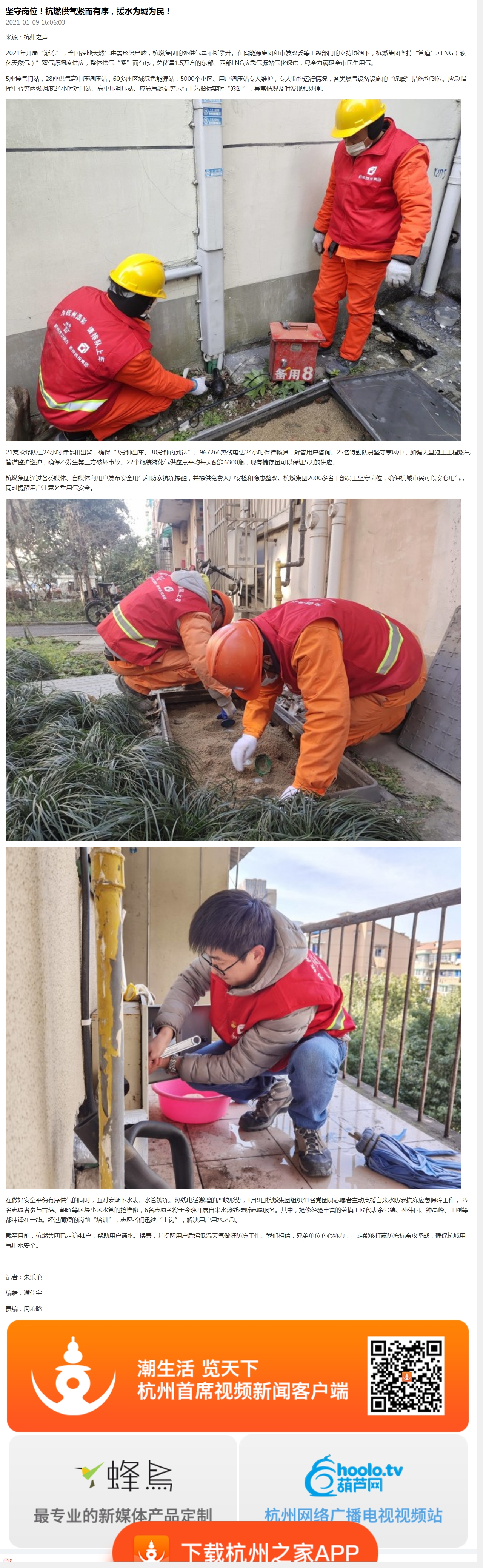杭燃集團(tuán)通過各類媒體、自媒體向用戶發(fā)布安全用氣和防寒抗凍提醒,并提供免費(fèi)入戶安檢和隱患整改。杭燃集團(tuán)2000多名干部員工堅(jiān)守崗位,確保杭城市民可以安心用氣,同時(shí)提醒用戶注意冬季用氣安全。