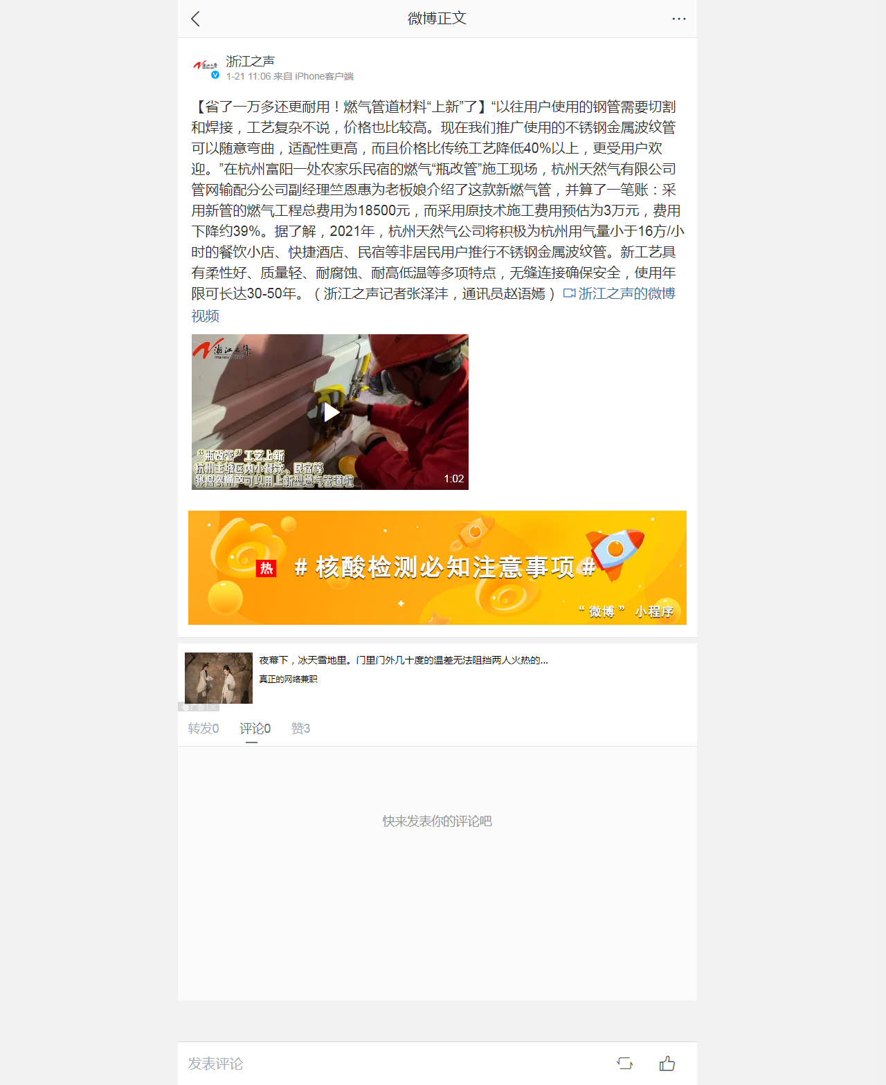 “以往用戶使用的鋼管需要切割和焊接,工藝復(fù)雜不說,價格也比較高。現(xiàn)在我們推廣使用的不銹鋼金屬波紋管可以隨意彎曲,適配性更高,而且價格比傳統(tǒng)工藝降低40%以上,更受用戶歡迎!痹诤贾莞魂栆惶庌r(nóng)家樂民宿的燃?xì)狻捌扛墓堋笔┕がF(xiàn)場,杭州天然氣有限公司管網(wǎng)輸配分公司副經(jīng)理竺恩惠為老板娘介紹了這款新燃?xì)夤埽⑺懔艘还P賬:采用新管的燃?xì)夤こ炭傎M用為18500元,而采用原技術(shù)施工費用預(yù)估為3萬元,費用下降約39%。據(jù)了解,2021年,杭州天然氣公司將積極為杭州用氣量小于16方/小時的餐飲小店、快捷酒店、民宿等非居民用戶推行不銹鋼金屬波紋管。新工藝具有柔性好、質(zhì)量輕、耐腐蝕、耐高低溫等多項特點,無縫連接確保安全,使用年限可長達(dá)30-50年。