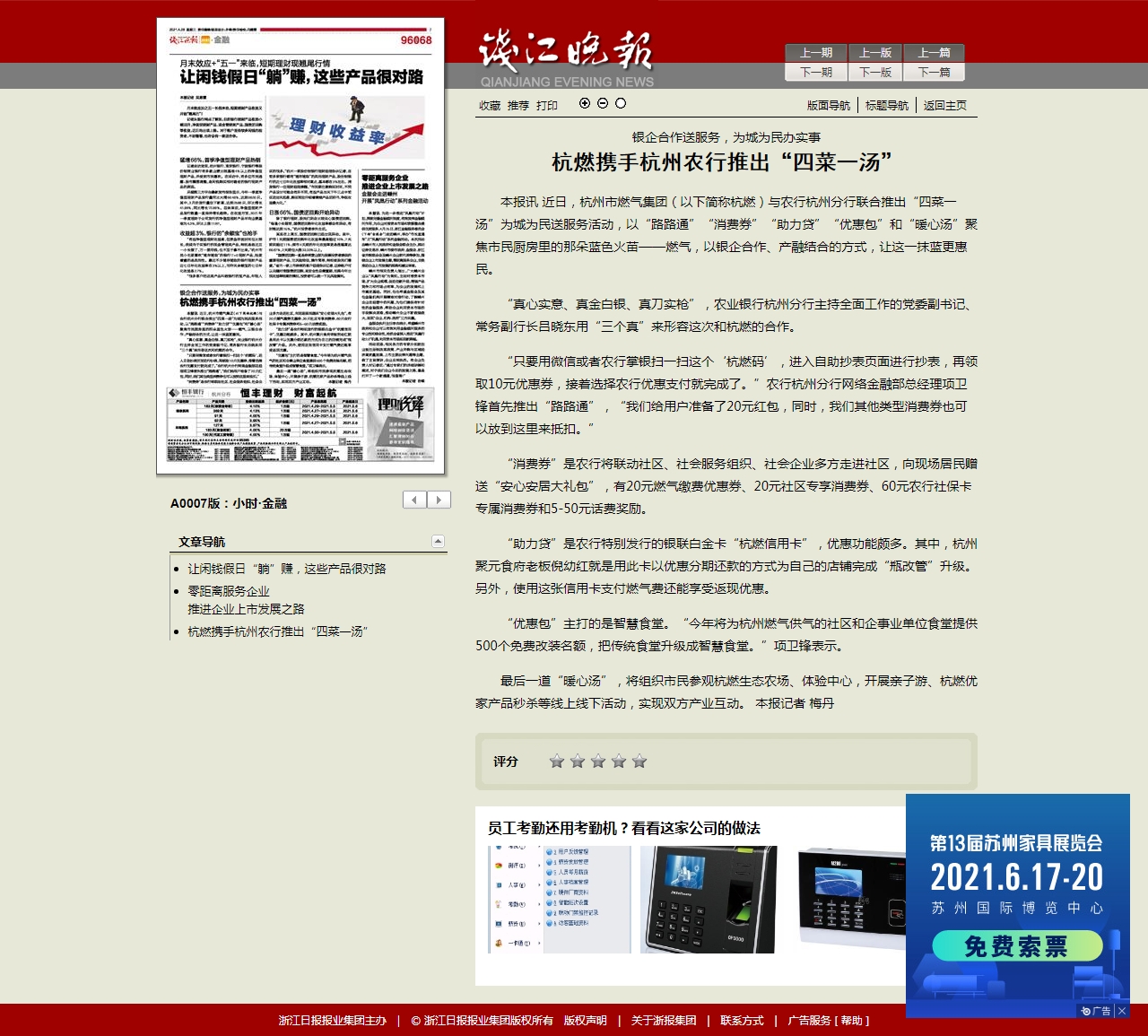 本報訊 近日,杭州市燃?xì)饧瘓F(tuán)(以下簡稱杭燃)與農(nóng)行杭州分行聯(lián)合推出“四菜一湯”為城為民送服務(wù)活動,以“路路通”“消費券”“助力貸”“優(yōu)惠包”和“暖心湯”聚焦市民廚房里的那朵藍(lán)色火苗——燃?xì),以銀企合作、產(chǎn)融結(jié)合的方式,讓這一抹藍(lán)更惠民。