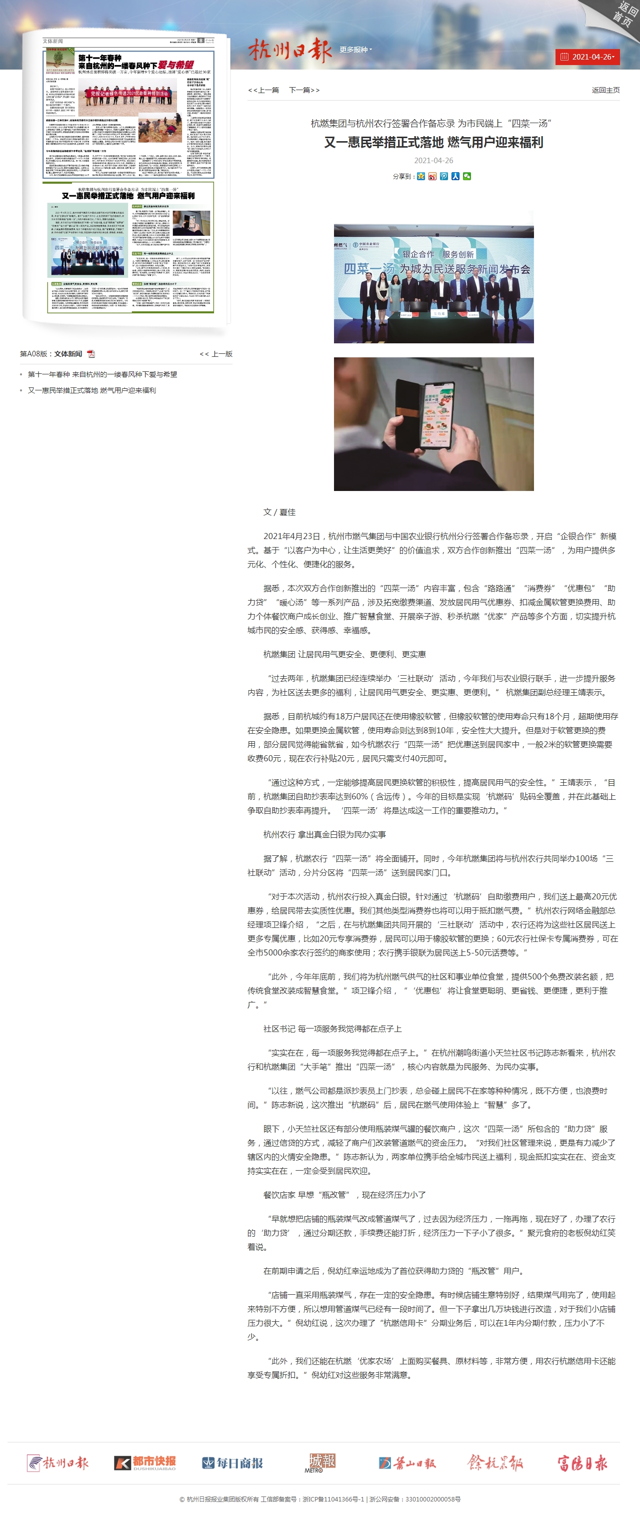 2021年4月23日,杭州市燃?xì)饧瘓F(tuán)與中國農(nóng)業(yè)銀行杭州分行簽署合作備忘錄,開啟“企銀合作”新模式;凇耙钥蛻魹橹行,讓生活更美好”的價(jià)值追求,雙方合作創(chuàng)新推出“四菜一湯”,為用戶提供多元化、個(gè)性化、便捷化的服務(wù)。