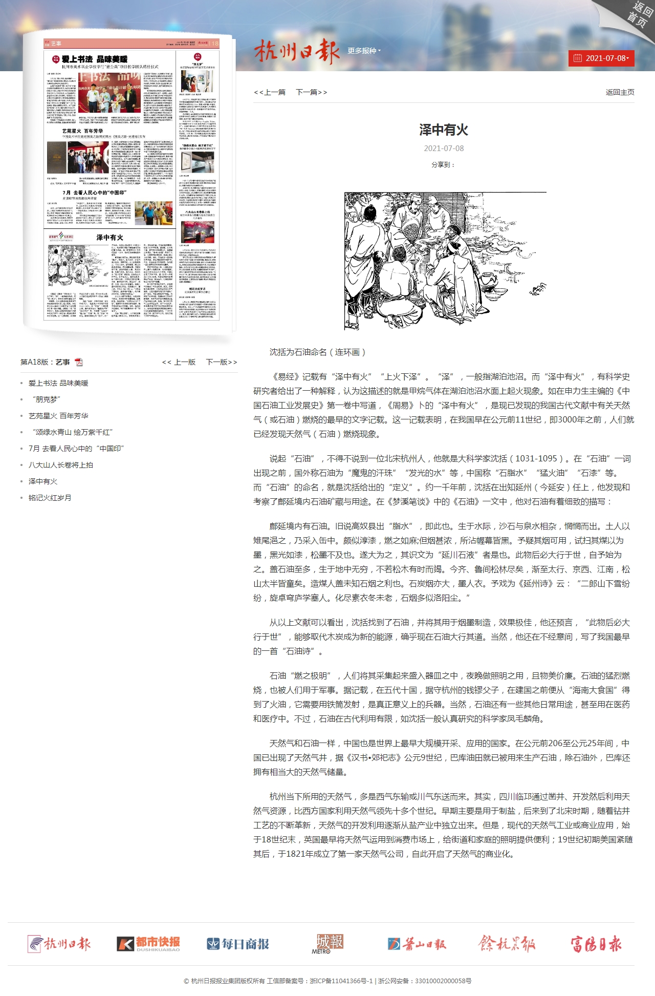 說起“石油”,不得不說到一位北宋杭州人,他就是大科學家沈括(1031-1095)。在“石油”一詞出現(xiàn)之前,國外稱石油為“魔鬼的汗珠”“發(fā)光的水”等,中國稱“石脂水”“猛火油”“石漆”等。而“石油”的命名,就是沈括給出的“定義”。約一千年前,沈括在出知延州(今延安)任上,他發(fā)現(xiàn)和考察了鄜延境內(nèi)石油礦藏與用途。在《夢溪筆談》中的《石油》一文中,他對石油有著細致的描寫: