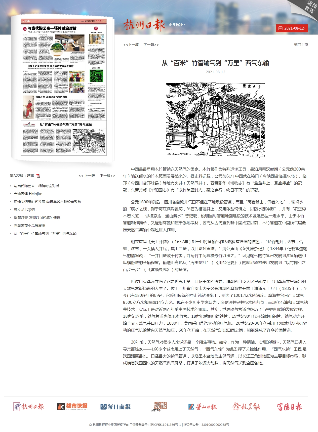 明宋應(yīng)星《天工開物》(1637年)對(duì)于用竹管輸氣作為燃料有詳細(xì)的描述:“長竹剖開,去節(jié),合縫,漆布,一頭插入井底,其上曲接,以口緊對(duì)釜臍。”清范聲山《花笑庼雜記》(1844年)記載管道輸氣的情況說:“一井口接數(shù)十竹者,并每竹中間復(fù)橫嵌竹以接之!笨梢娸敋獾闹窆芤寻l(fā)展到多管輸送和縱橫銜接的分輸程度。輸送距離也從“周圍砌灶”(《川鹽記要》)的就地取材使用發(fā)展到“以竹筒引之百步千步”(《富順縣志》)的長度。