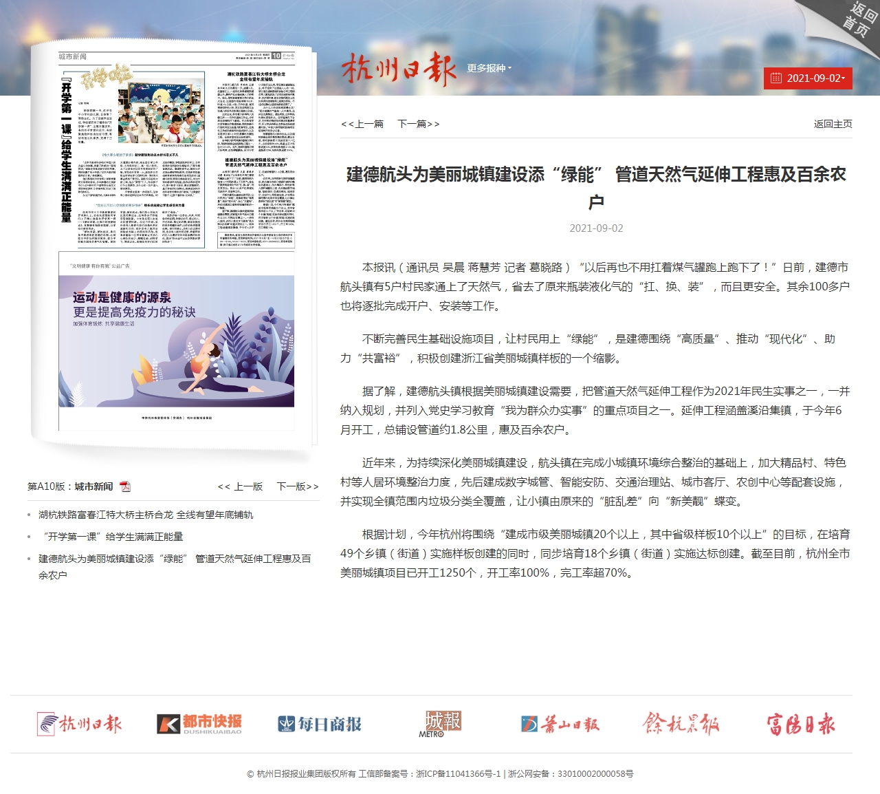 據(jù)了解,建德航頭鎮(zhèn)根據(jù)美麗城鎮(zhèn)建設需要,把管道天然氣延伸工程作為2021年民生實事之一,一并納入規(guī)劃,并列入黨史學習教育“我為群眾辦實事”的重點項目之一。延伸工程涵蓋溪沿集鎮(zhèn),于今年6月開工,總鋪設管道約1.8公里,惠及百余農戶。