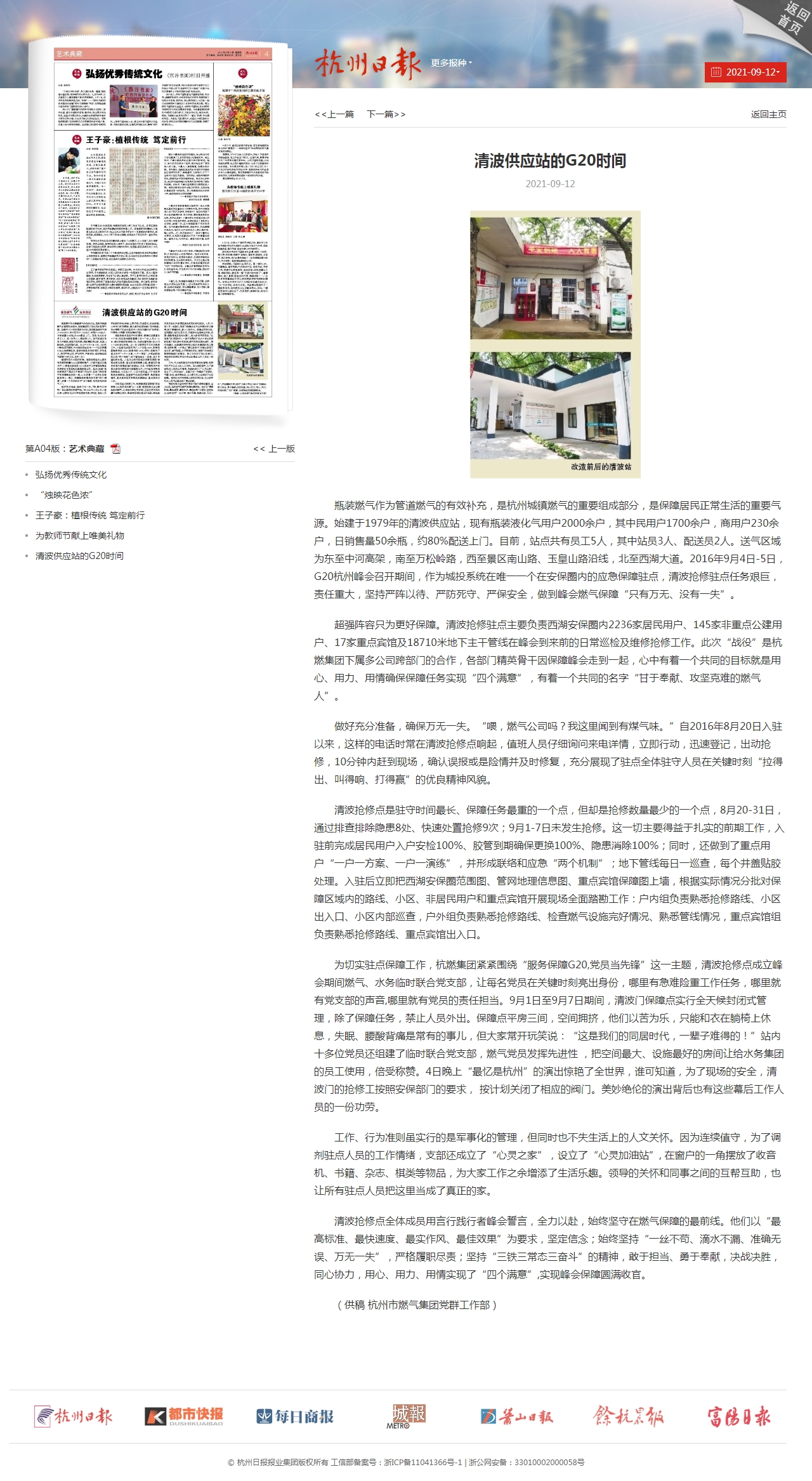 瓶裝燃?xì)庾鳛楣艿廊細(xì)獾挠行аa(bǔ)充,是杭州城鎮(zhèn)燃?xì)獾闹匾M成部分,是保障居民正常生活的重要?dú)庠。始建?979年的清波供應(yīng)站,現(xiàn)有瓶裝液化氣用戶2000余戶,其中民用戶1700余戶,商用戶230余戶,日銷售量50余瓶,約80%配送上門。目前,站點(diǎn)共有員工5人,其中站員3人、配送員2人。送氣區(qū)域?yàn)闁|至中河高架,南至萬松嶺路,西至景區(qū)南山路、玉皇山路沿線,北至西湖大道。2016年9月4日-5日,G20杭州峰會召開期間,作為城投系統(tǒng)在唯一一個(gè)在安保圈內(nèi)的應(yīng)急保障駐點(diǎn),清波搶修駐點(diǎn)任務(wù)艱巨,責(zé)任重大,堅(jiān)持嚴(yán)陣以待、嚴(yán)防死守、嚴(yán)保安全,做到峰會燃?xì)獗U稀爸挥腥f無、沒有一失”。