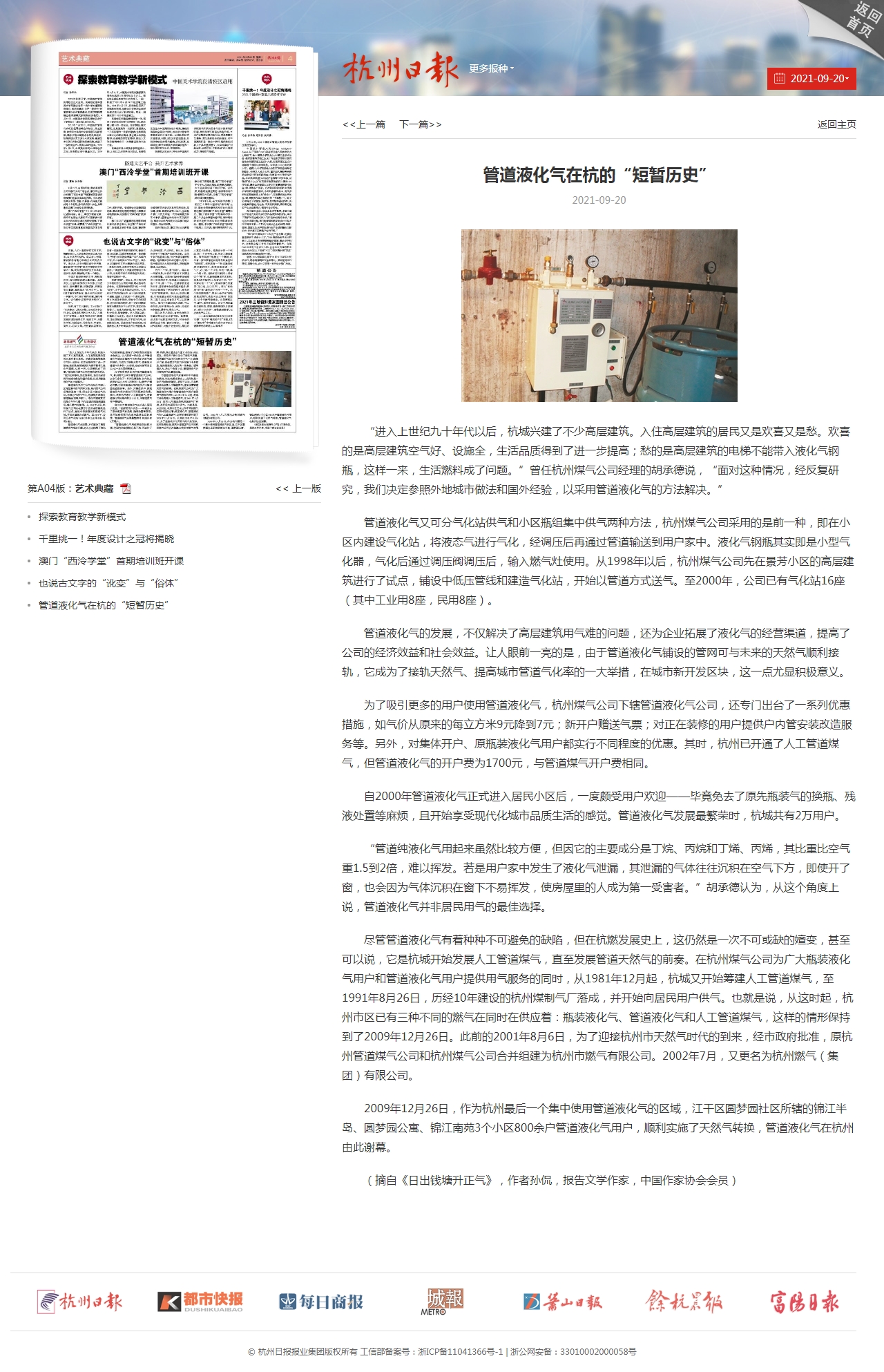 2009年12月26日,作為杭州最后一個集中使用管道液化氣的區(qū)域,江干區(qū)圓夢園社區(qū)所轄的錦江半島、圓夢園公寓、錦江南苑3個小區(qū)800余戶管道液化氣用戶,順利實施了天然氣轉(zhuǎn)換,管道液化氣在杭州由此謝幕。