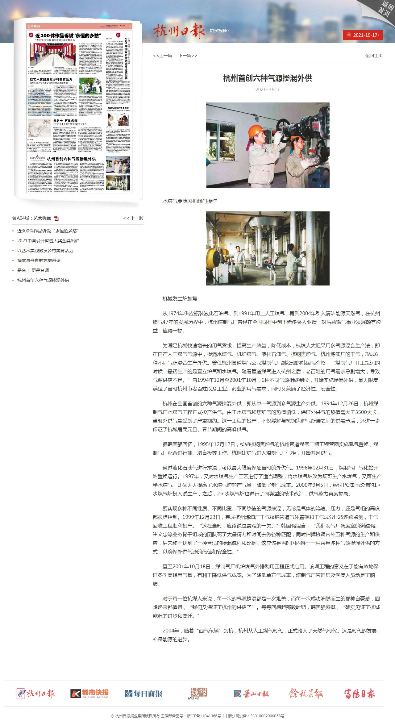 為滿足杭城快速增長的用氣需求,提高生產(chǎn)效益,降低成本,杭煤人大膽采用多氣源混合生產(chǎn)法,即在自產(chǎn)人工煤氣氣源中,摻混水煤氣、機爐煤氣、液化石油氣、杭鋼焦爐氣、杭州煉油廠的干氣,形成6種不同氣源混合生產(chǎn)外供。曾任杭州管道煤氣公司煤制氣廠副經(jīng)理的韓國強介紹,“煤制氣廠開工投運的時候,最初生產(chǎn)的是直立爐氣和水煤氣。隨著管道煤氣進入杭州之后,老百姓的用氣需求急劇增大,導(dǎo)致氣源供應(yīng)不足!弊1994年12月至2001年10月,6種不同氣源相繼到位,開始實施摻混外供,最大限度滿足了當時杭州市老百姓以及工業(yè)、商業(yè)的用氣需求,同時又兼顧了經(jīng)濟性、安全性。