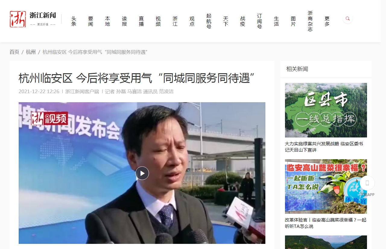 2021年12月22日,杭州臨安燃?xì)庥邢薰緬炫。記者了解到,這是在天然氣體制改革背景下,全國首家由央企、省屬國企、市屬國企合作整合資源成立的城市燃?xì)馄髽I(yè),今后60多萬臨安區(qū)百姓將享受與杭州主城區(qū)用氣“同城同服務(wù)同待遇”。