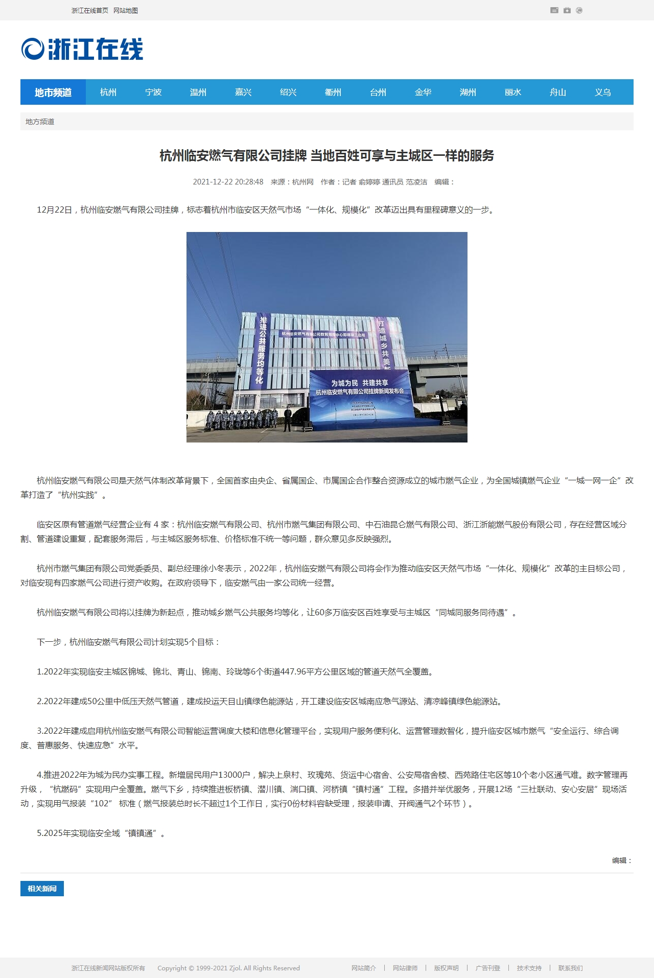 12月22日,杭州臨安燃?xì)庥邢薰緬炫疲瑯?biāo)志著杭州市臨安區(qū)天然氣市場“一體化、規(guī);备母镞~出具有里程碑意義的一步。