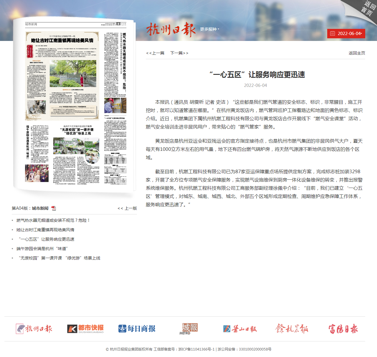截至目前,杭燃工程科技有限公司已為87家亞運(yùn)保障重點(diǎn)場(chǎng)所提供定制方案,完成標(biāo)志樁加裝3298家,開(kāi)展了全方位專項(xiàng)燃?xì)獍踩U戏⻊?wù),實(shí)現(xiàn)燃?xì)庠O(shè)施維保到廚房一體化設(shè)備維保的轉(zhuǎn)變,并推出報(bào)警系統(tǒng)維保服務(wù)。杭州杭燃工程科技有限公司工商服務(wù)部副經(jīng)理徐佩中介紹:“目前,我們已建立‘一心五區(qū)’管理模式,對(duì)城東、城南、城西、城北、外部五個(gè)區(qū)域形成定期檢查、周期維護(hù)應(yīng)急保障工作體系,服務(wù)響應(yīng)更迅速了。”