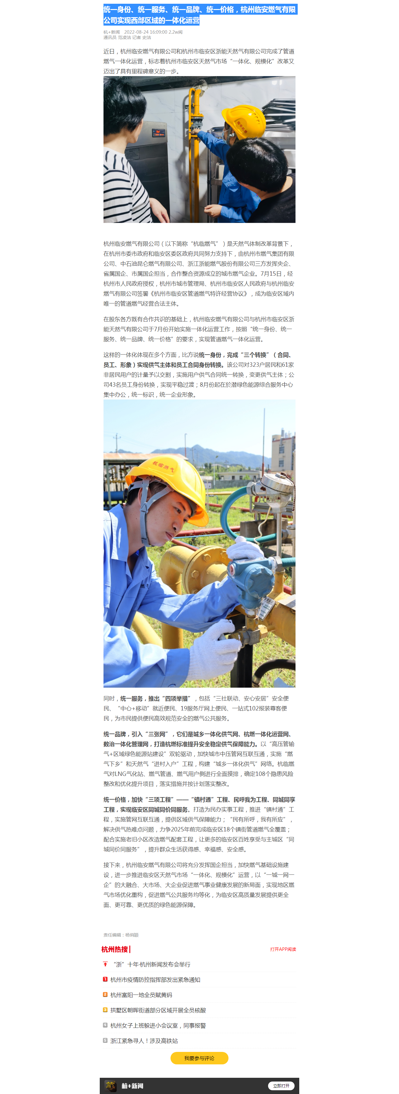 在股東各方既有合作共識(shí)的基礎(chǔ)上,杭州臨安燃?xì)庥邢薰九c杭州市臨安區(qū)浙能天然氣有限公司于7月份開始實(shí)施一體化運(yùn)營(yíng)工作,按照“統(tǒng)一身份、統(tǒng)一服務(wù)、統(tǒng)一品牌、統(tǒng)一價(jià)格”的要求,實(shí)現(xiàn)管道燃?xì)庖惑w化運(yùn)營(yíng)。