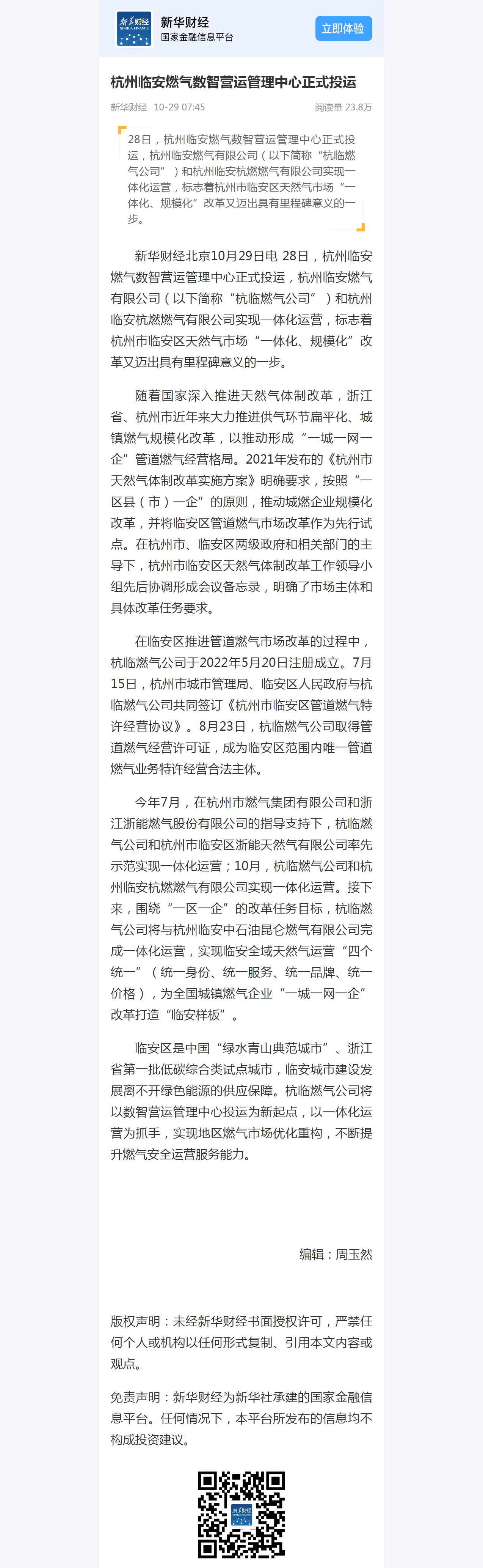在臨安區(qū)推進(jìn)管道燃?xì)馐袌龈母锏倪^程中,杭臨燃?xì)夤居?022年5月20日注冊成立。7月15日,杭州市城市管理局、臨安區(qū)人民政府與杭臨燃?xì)夤竟餐炗啞逗贾菔信R安區(qū)管道燃?xì)馓卦S經(jīng)營協(xié)議》。8月23日,杭臨燃?xì)夤救〉霉艿廊細(xì)饨?jīng)營許可證,成為臨安區(qū)范圍內(nèi)唯一管道燃?xì)鈽I(yè)務(wù)特許經(jīng)營合法主體。