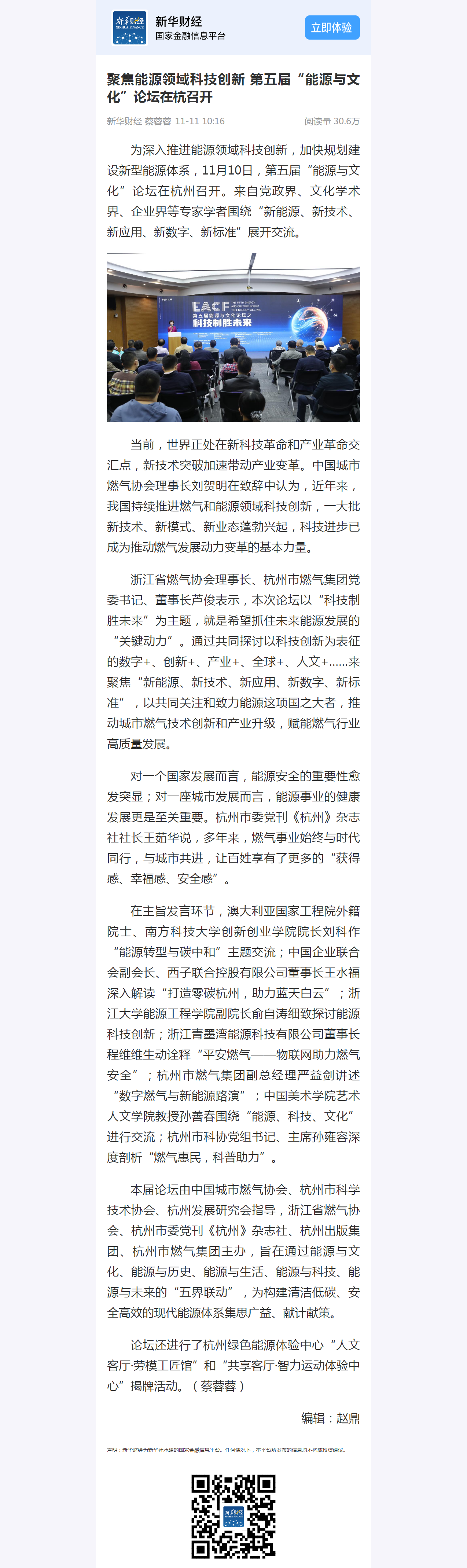 本屆論壇由中國城市燃氣協(xié)會、杭州市科學技術(shù)協(xié)會、杭州發(fā)展研究會指導,浙江省燃氣協(xié)會、杭州市委黨刊《杭州》雜志社、杭州出版集團、杭州市燃氣集團主辦,旨在通過能源與文化、能源與歷史、能源與生活、能源與科技、能源與未來的“五界聯(lián)動”,為構(gòu)建清潔低碳、安全高效的現(xiàn)代能源體系集思廣益、獻計獻策。