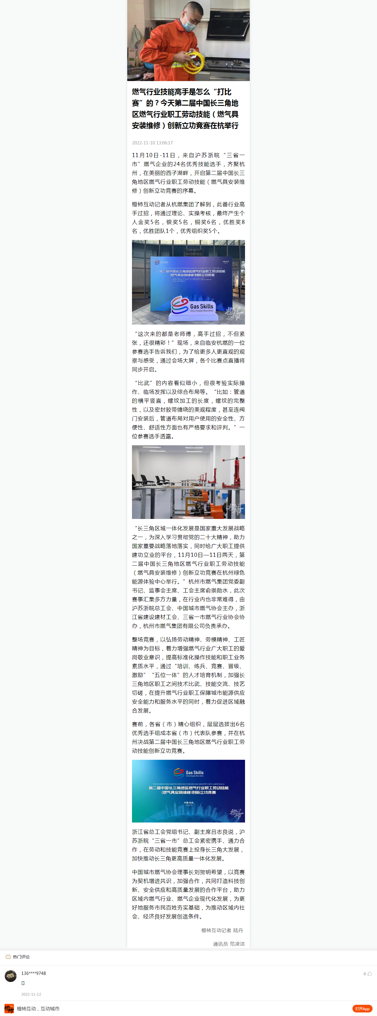 “長三角區(qū)域一體化發(fā)展是國家重大發(fā)展戰(zhàn)略之一,為深入學(xué)習(xí)貫徹黨的二十大精神,助力國家重要戰(zhàn)略落地落實,同時給廣大職工提供建功立業(yè)的平臺,11月10日—11日兩天,第二屆中國長三角地區(qū)燃?xì)庑袠I(yè)職工勞動技能(燃?xì)饩甙惭b維修)創(chuàng)新立功競賽在杭州綠色能源體驗中心舉行。”杭州市燃?xì)饧瘓F(tuán)黨委副書記、監(jiān)事會主席、工會主席俞崇勛水,此次賽事匯集多方力量,在行業(yè)內(nèi)也非常難得,由滬蘇浙皖總工會、中國城市燃?xì)鈪f(xié)會主辦,浙江省建設(shè)建材工會、三省一市燃?xì)庑袠I(yè)協(xié)會協(xié)辦,杭州市燃?xì)饧瘓F(tuán)有限公司負(fù)責(zé)承辦。
