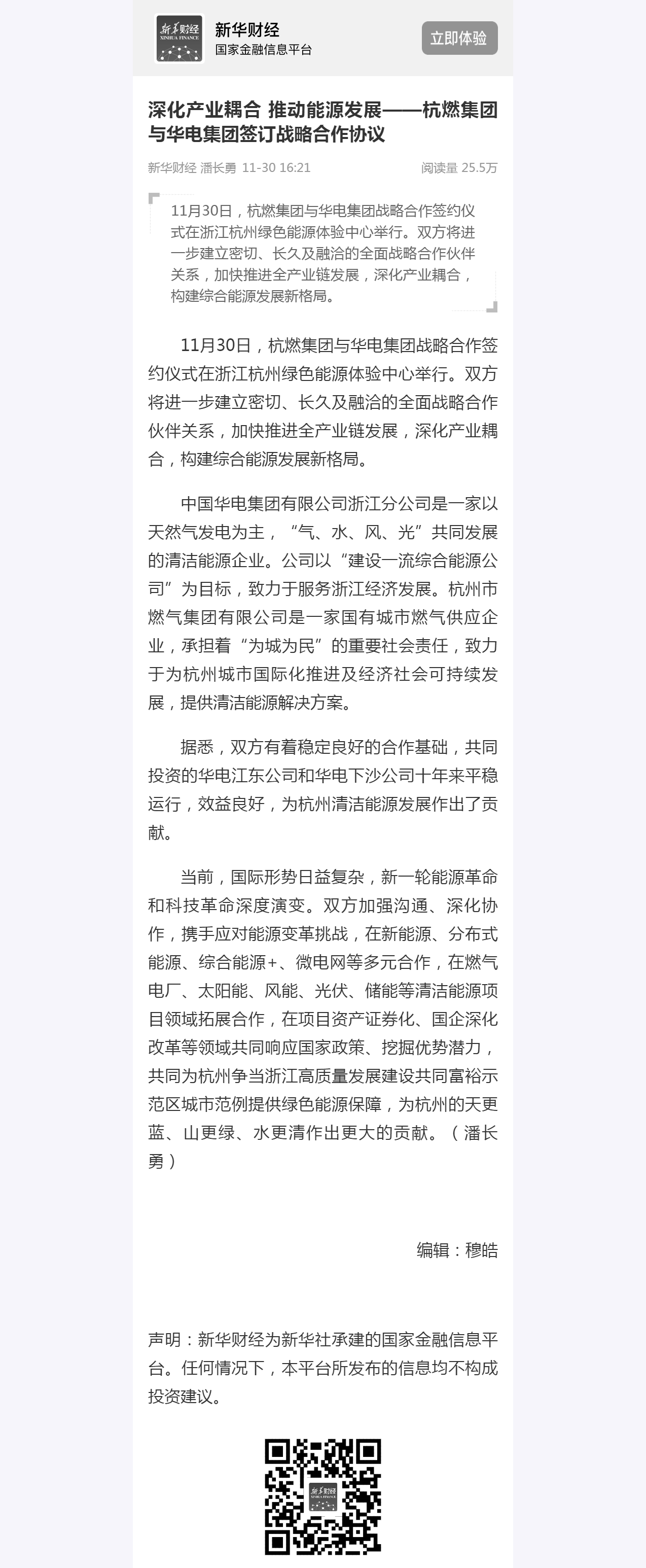 11月30日,杭燃集團與華電集團戰(zhàn)略合作簽約儀式在浙江杭州綠色能源體驗中心舉行。雙方將進一步建立密切、長久及融洽的全面戰(zhàn)略合作伙伴關系,加快推進全產業(yè)鏈發(fā)展,深化產業(yè)耦合,構建綜合能源發(fā)展新格局。