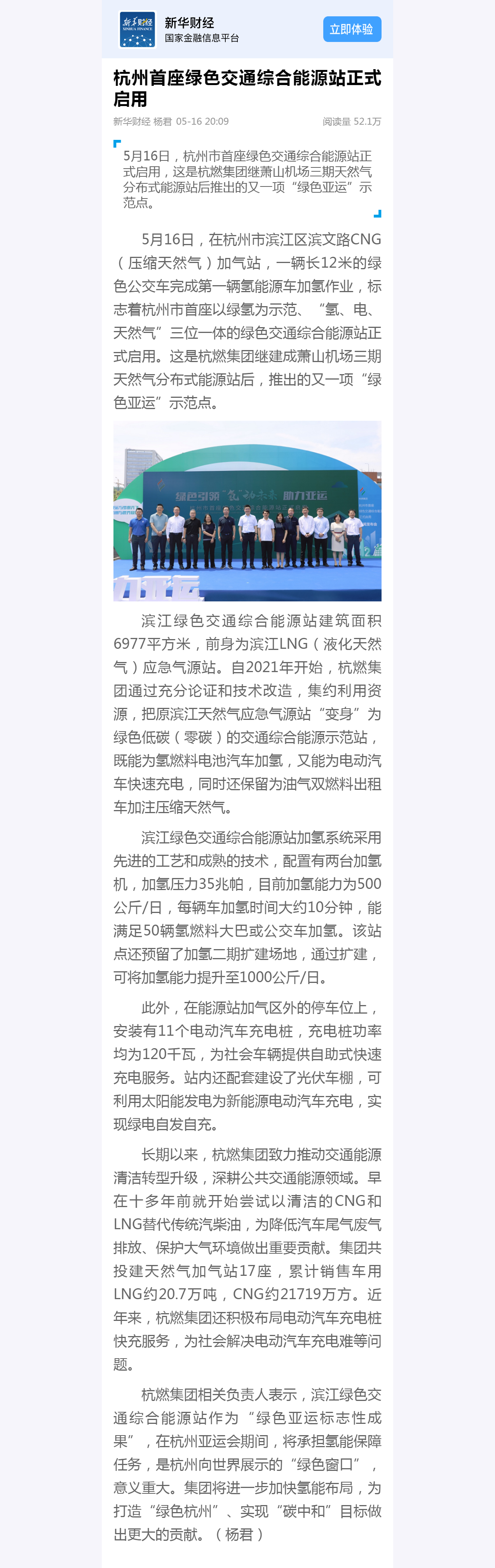 5月16日,在杭州市濱江區(qū)濱文路CNG(壓縮天然氣)加氣站,一輛長12米的綠色公交車完成第一輛氫能源車加氫作業(yè),標志著杭州市首座以綠氫為示范、“氫、電、天然氣”三位一體的綠色交通綜合能源站正式啟用。這是杭燃集團繼建成蕭山機場三期天然氣分布式能源站后,推出的又一項“綠色亞運”示范點。
