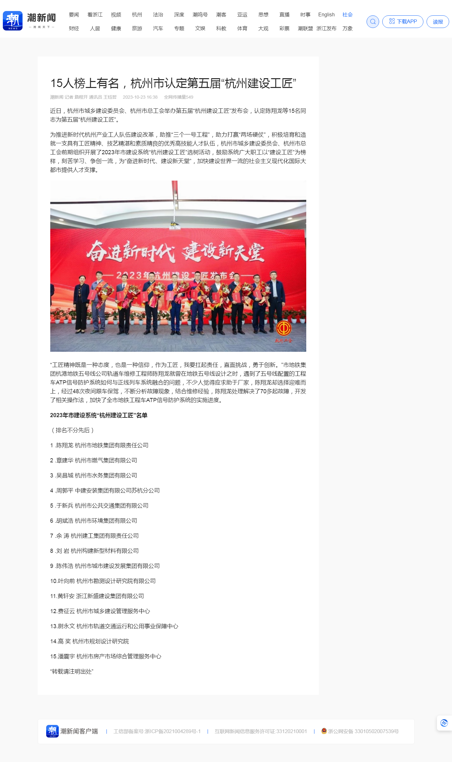 近日,杭州市城鄉(xiāng)建設(shè)委員會、杭州市總工會舉辦第五屆“杭州建設(shè)工匠”發(fā)布會,認定陳翔龍等15名同志為第五屆“杭州建設(shè)工匠”。