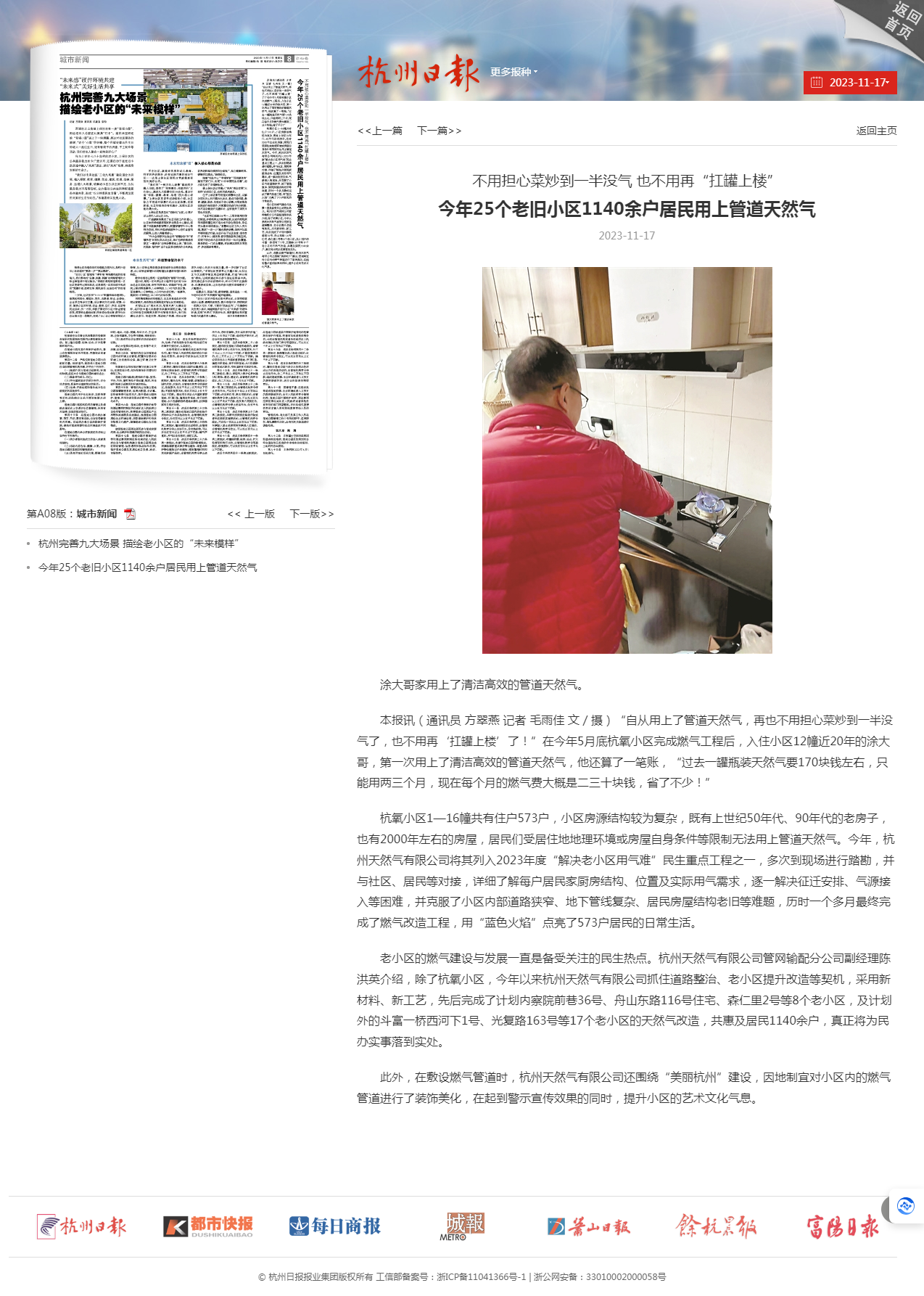 老小區(qū)的燃?xì)饨ㄔO(shè)與發(fā)展一直是備受關(guān)注的民生熱點(diǎn)。杭州天然氣有限公司管網(wǎng)輸配分公司副經(jīng)理陳洪英介紹,除了杭氧小區(qū),今年以來杭州天然氣有限公司抓住道路整治、老小區(qū)提升改造等契機(jī),采用新材料、新工藝,先后完成了計(jì)劃內(nèi)察院前巷36號(hào)、舟山東路116號(hào)住宅、森仁里2號(hào)等8個(gè)老小區(qū),及計(jì)劃外的斗富一橋西河下1號(hào)、光復(fù)路163號(hào)等17個(gè)老小區(qū)的天然氣改造,共惠及居民1140余戶,真正將為民辦實(shí)事落到實(shí)處。