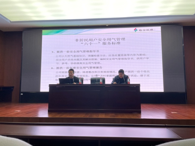 臨安杭燃對非居民用戶用氣過程中常見安全用氣隱患進行分析。同時邀請了燃氣報警設備廠家和施工單位,對燃氣報警探測系統(tǒng)的構成及工作原理、燃氣設施維保服務等內容進行培訓宣貫。