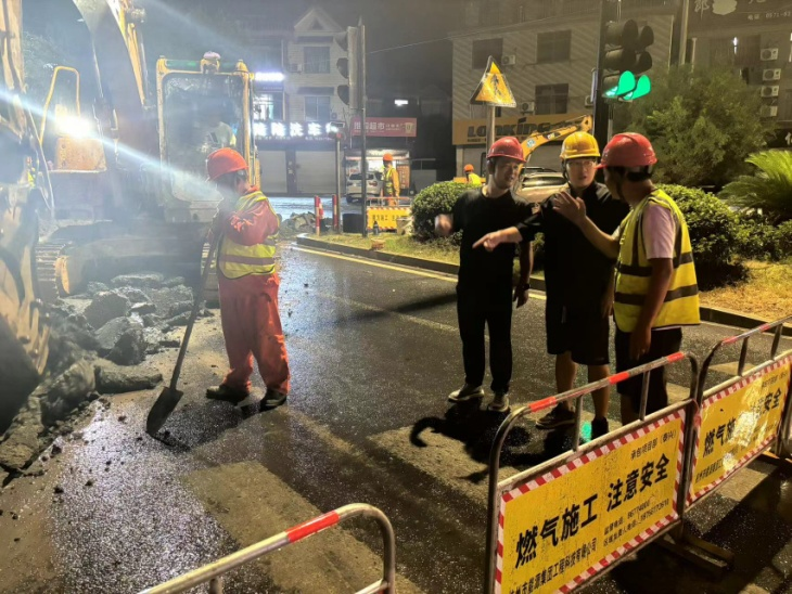 吳越街與杭徽高速管理中心接線工程位于杭徽高速玲瓏互通口,是臨安區(qū)的交通要道,全天車流量大,而G329建設(shè)施工又迫在眉睫,杭臨燃氣積極聯(lián)系臨安區(qū)交警大隊、玲瓏交警中隊進行現(xiàn)場踏勘,多次優(yōu)化破道施工方案,9月12日完成道路施工審批。隨后施工員加班加點、緊盯項目進度并協(xié)調(diào)各項工作,經(jīng)過連續(xù)四天的通宵奮戰(zhàn),9月26日完成吳越街與杭徽高速管理中心接線施工。