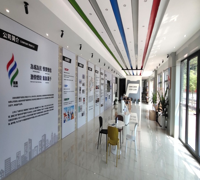 為慶祝建黨百年,自2021年6月開始,淳安公司就開始設(shè)計打造 “淳安杭燃新客廳”,及拍攝企業(yè)宣傳片,至7月底完工,8月中旬正式亮相。公司宣傳片時長5分18秒,通過黨建紅色引領(lǐng)、燃氣綠色發(fā)展為主線貫穿,介紹了淳安公司的成立背景、歷程、價值理念、十四五規(guī)劃等;公司“企業(yè)文化墻”長17米、高2.7米,面積達46平方米,整面墻以大氣恢宏的青白色為主色調(diào),通過“公司簡介、企業(yè)愿景、重要歷程、杭燃供氣、杭燃服務(wù)、氣蘊杭燃、智數(shù)杭燃、杭燃優(yōu)家微體驗”等8大模塊組成,全方位的展示了公司的企業(yè)文化形象和足跡。