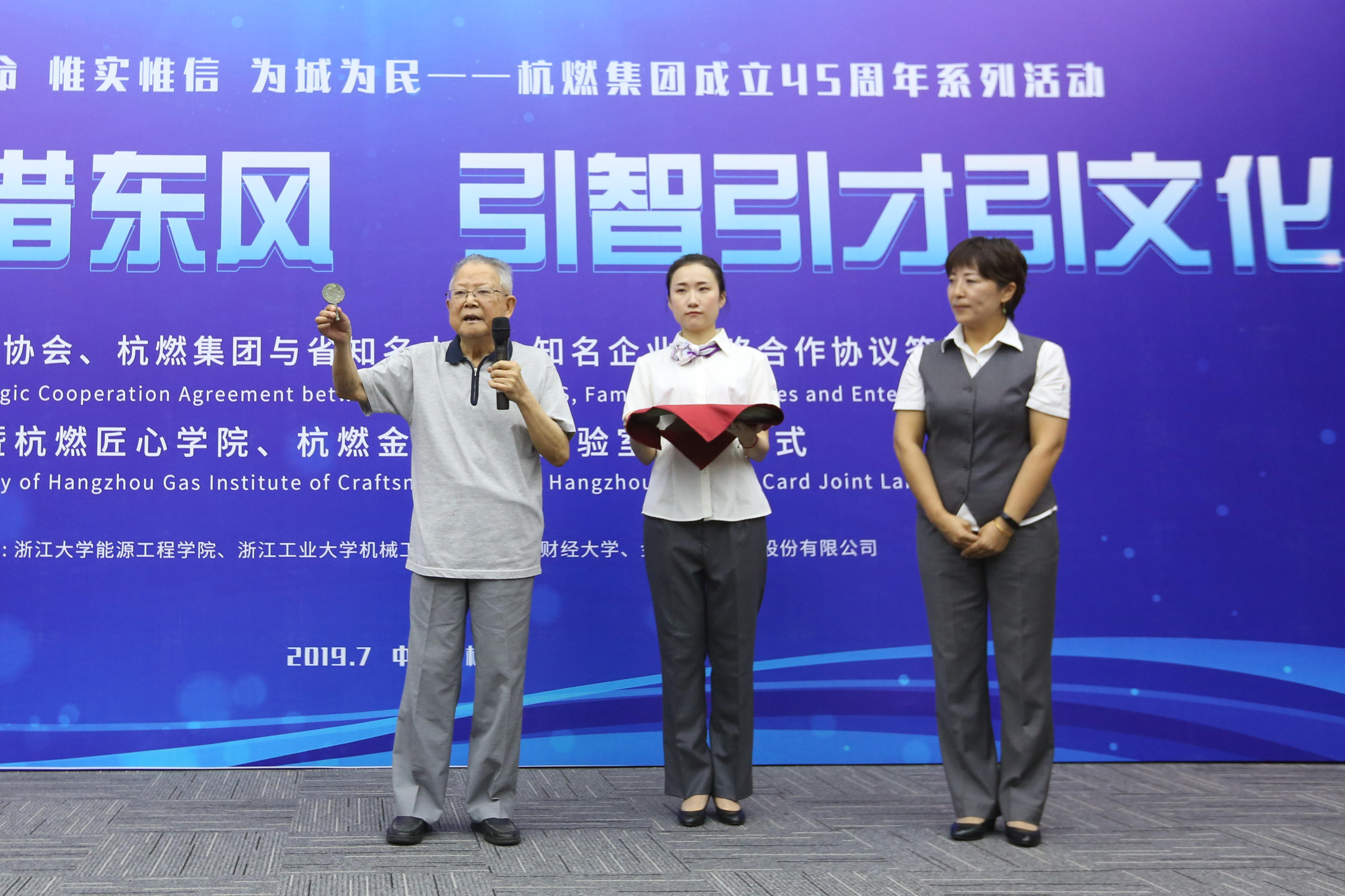 發(fā)布會(huì)上,杭燃集團(tuán)黨委書記、董事長蘆俊代表浙江省燃?xì)鈪f(xié)會(huì)、杭燃集團(tuán)對(duì)到會(huì)的嘉賓表示由衷的感謝和誠摯的敬意。俞自濤、楊斌、陳永堅(jiān)分別代表浙江大學(xué)能源工程學(xué)院、金卡智能集團(tuán)、合作單位進(jìn)行致辭。杭燃集團(tuán)黨委副書記、總經(jīng)理盧智宏與浙江大學(xué)能源工程學(xué)院、浙江工業(yè)大學(xué)機(jī)械工程學(xué)院、浙江財(cái)經(jīng)大學(xué)、金卡智能集團(tuán)簽訂戰(zhàn)略合作協(xié)議。杭州陶瓷印藝術(shù)館館長、浙江省工藝大師、著名篆刻家、綠色義工蔡履平先生為杭州綠色能源體驗(yàn)中心捐贈(zèng)用天然氣燒制的“杭燃八杰”陶瓷圖章。浙江省中醫(yī)大學(xué)原教授、西泠印社五老、綠色義工林乾良先生為杭州綠色能源體驗(yàn)中心捐贈(zèng)唐、宋、元代陽燧鏡。