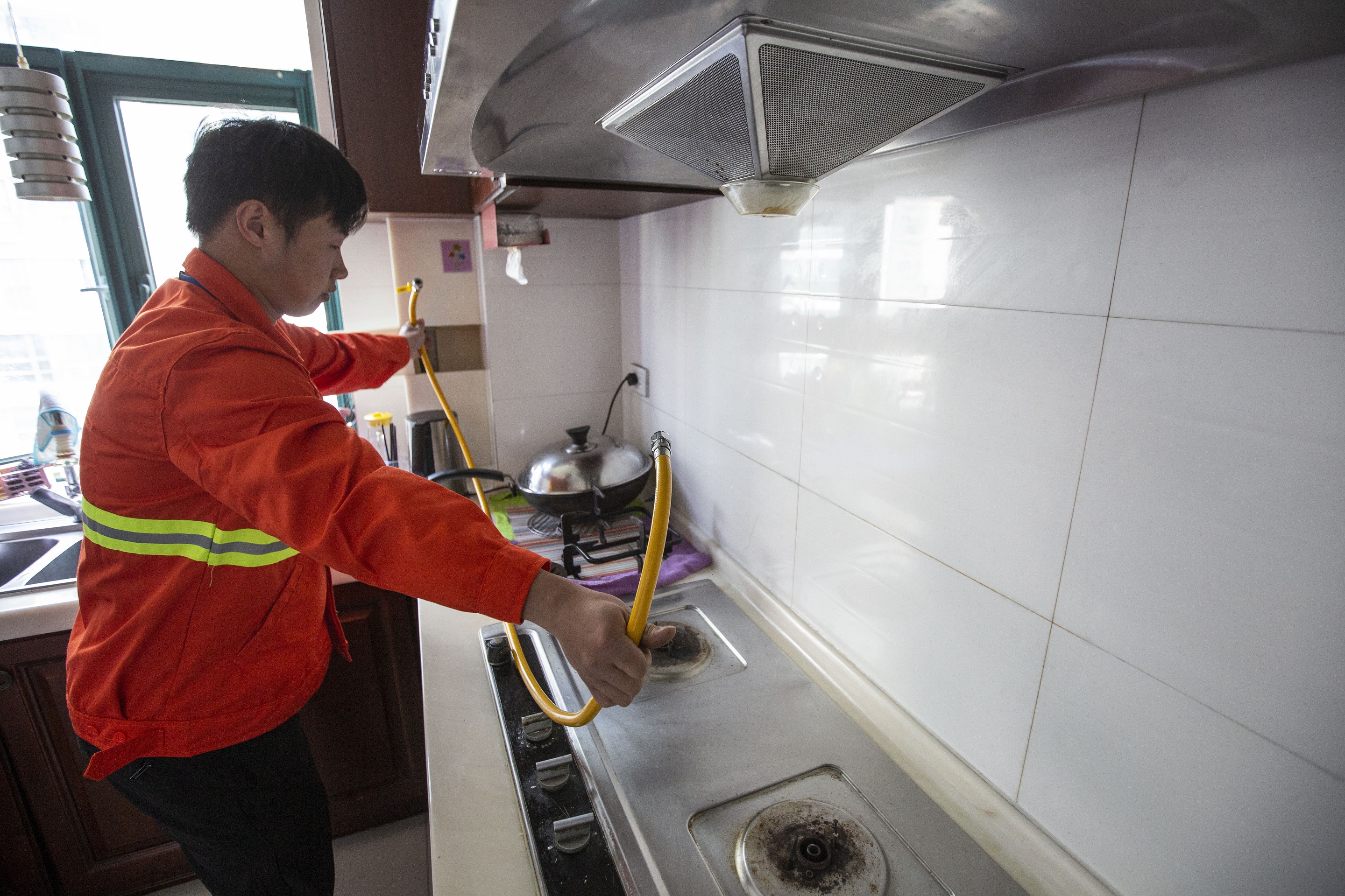 圖為居民用戶更換金屬軟管現(xiàn)場